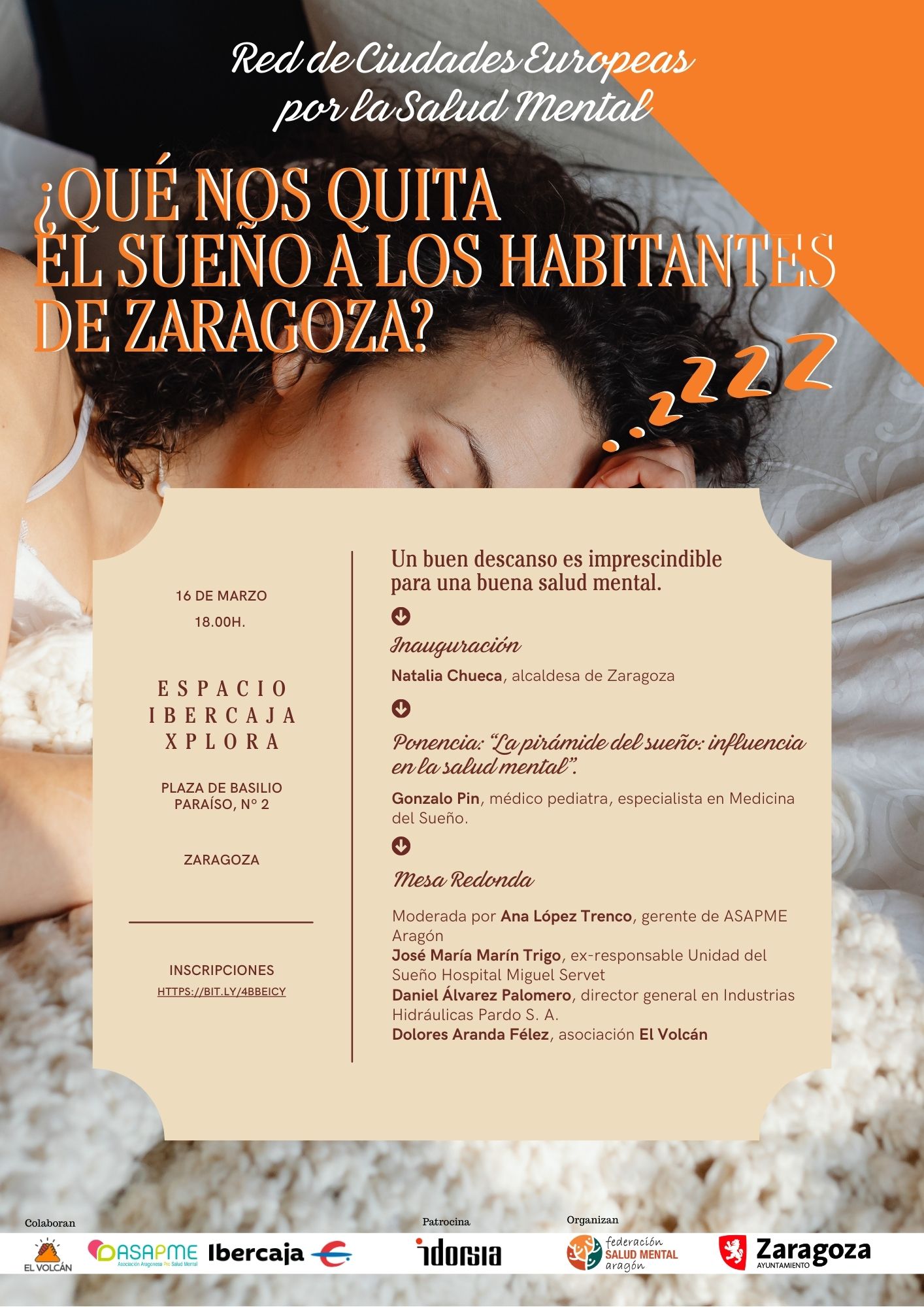 Asapme Aragón nos invita a la jornada “¿Qué nos quita el sueño a los habitantes de Zaragoza?” organizada el próximo día 16 de marzo junto al Ayuntamiento de Zaragoza. Se trata de la primera de las iniciativas que, a través de la Federación Salud Mental Aragón, se van a llevar a cabo a raíz de la adhesión de Zaragoza a la Red Europea de Ciudades Europeas por la Salud Mental y en la que contaremos con destacados ponentes, especialistas en el descanso nocturno e insomnio.