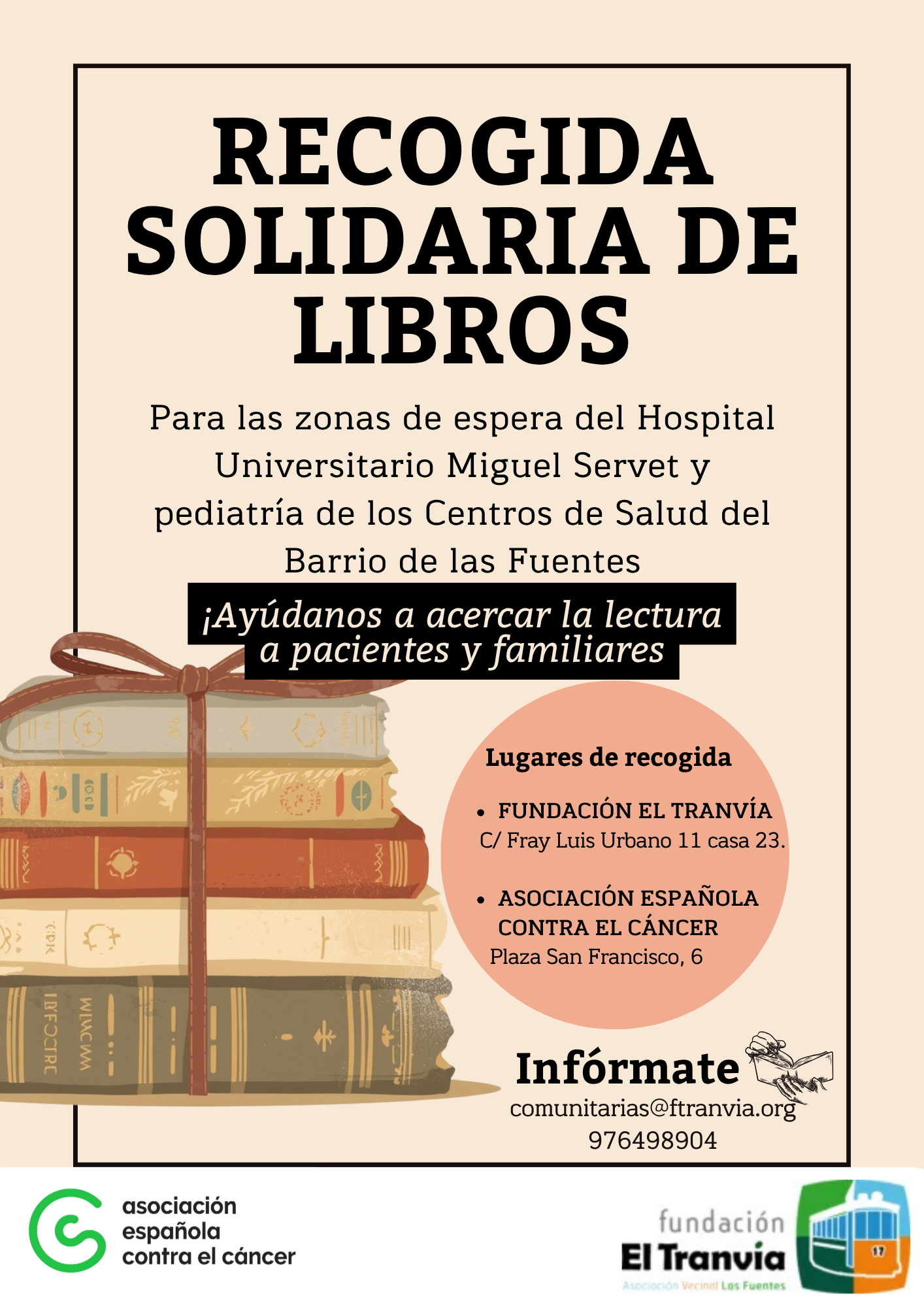 Las personas interesadas pueden entregar libros en la sede de la Fundación El Tranvía (C/ Fray Luis Urbano, 11) o en la Asociación Española Contra el Cáncer (Plaza San Francisco, 6), en horario de mañana y tarde de lunes a jueves, y los viernes en horario de mañana.