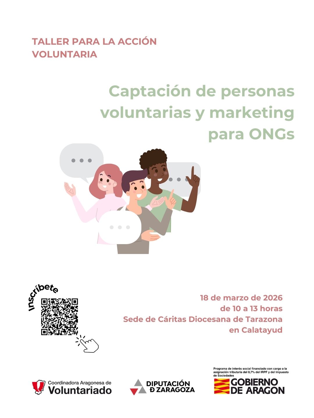 El próximo día 18 de marzo tendrá lugar este taller en la Sede de Cáritas Diocesana de Tarazona en Calatayud. Es un curso gratuito para personas responsables y voluntarias implicadas en la gestión de las entidades en el que se abordarán estrategias para la captación de personas voluntarias y otros aspectos vinculados con el marketing aplicado a la realidad de las ONG. Las inscripciones pueden formalizarse en este enlace.