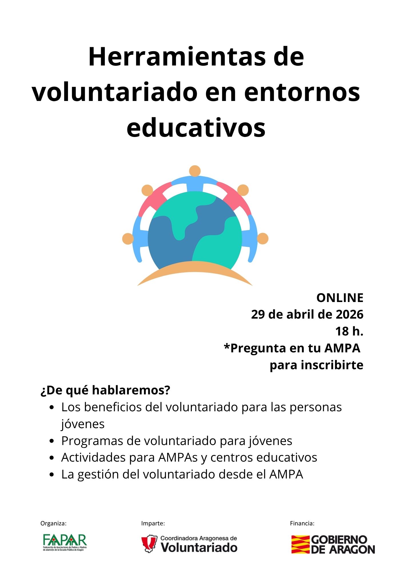 La reunión tendrá lugar el 29 de abril, a las 18 h. y será online para facilitar la asistencia desde distintos puntos de Aragón. Para asistir, es necesario ponerse en contacto con tu AMPA de referencia.