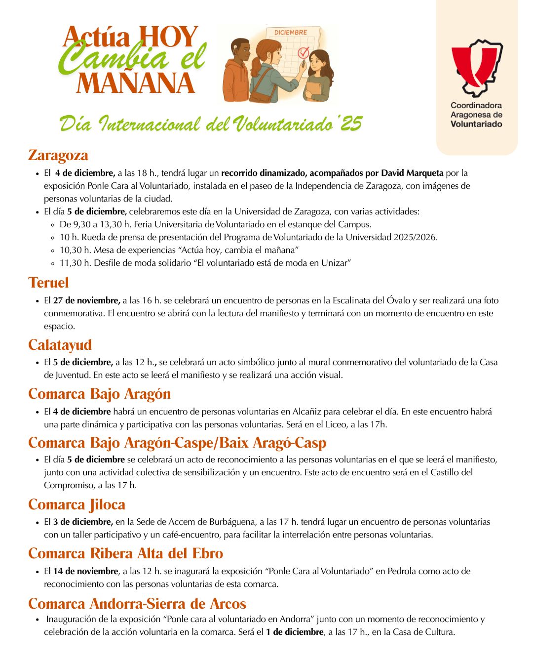El 4 de diciembre habrá un encuentro de personas voluntarias en Alcañiz para celebrar el día. En este encuentro habrá una parte dinámica y participativa con las personas voluntarias. Será en el Liceo, a las 17 h.