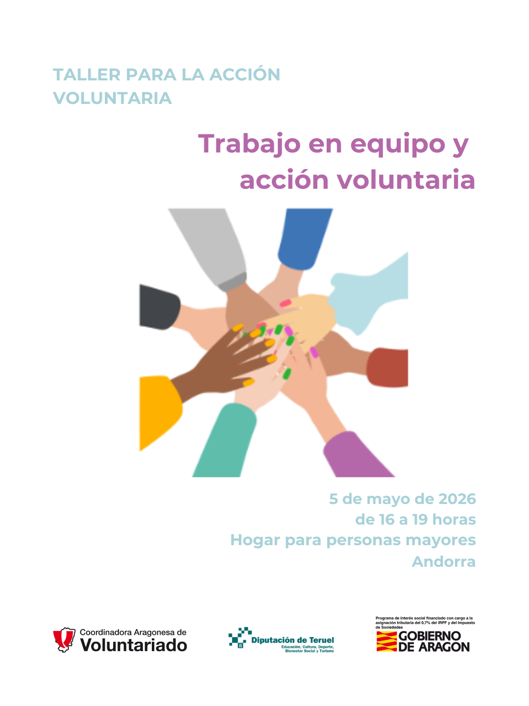 El responsable de estos datos es la Coordinadora Aragonesa de Voluntariado con CIF G 50507599 y ubicada en Avda. Cesáreo Alierta, 4 Pasaje Miraflores, Local 3. La finalidad de los datos será enviar información sobre actividades, talleres y acciones relacionadas con el voluntariado. En ningún momento se prevé la cesión de estos datos a terceros.