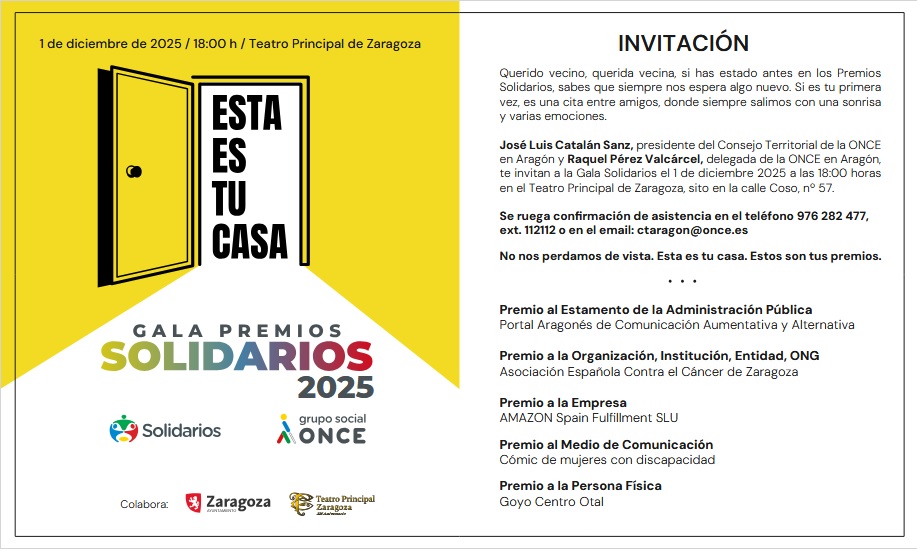 La ONCE celebra la “Gala Premios Solidarios del Grupo Social ONCE Aragón – Edición 2025”, que tendrá lugar el próximo 1 de diciembre a las 18 horas en el Teatro Principal de Zaragoza, en la que se reconocerá a entidades, administraciones, medios y otros agentes sociales que trabajan por la inclusión en Aragón.