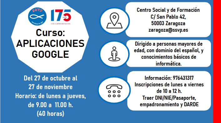 La Sociedad San Vicente de Paúl ha organizado un taller de «Aplicaciones Google», que tendrá lugar del 27 de octubre al 27 de noviembre, de lunes a jueves, de 9 a 11 h. (40 h.)
