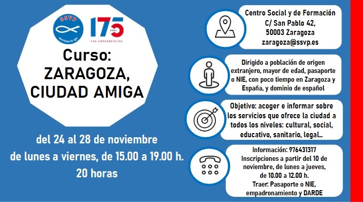 La Sociedad San Vicente de Paúl impulsa la celebración del taller «Zaragoza, ciudad amiga», que tendrá lugar del 24 al 28 de noviembre, de 15 a 19 h. con una duración de 20 horas. El taller va dirigido a población de origen extranjero, mayores de edad, que lleven poco tiempo en Zaragoza y España.