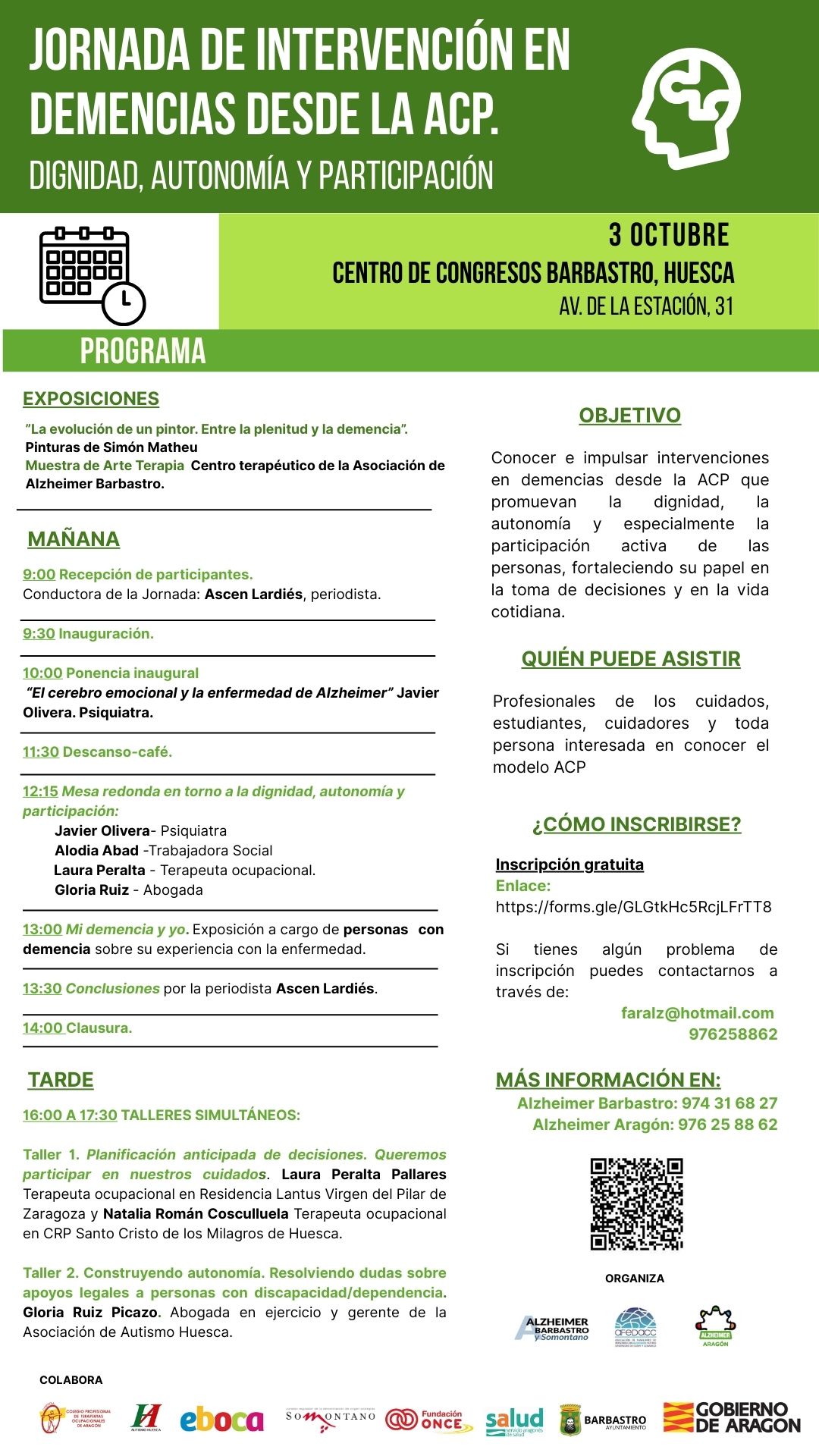 La Federación de Asociaciones de Familiares de Personas con Alzheimer y otras demencias, (Alzheimer Aragón-FARAL), organiza el próximo 3 de octubre, en el Centro de Congresos de Barbastro (Av. de la Estación, 31), una Jornada de Intervención en demencias desde la ACP (Atención Centrada en la Persona), bajo el subtítulo de Dignidad, autonomía y participación.