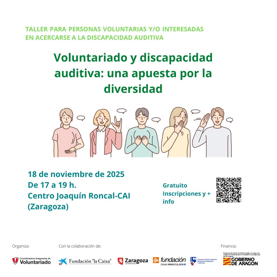 Dentro de nuestro trabajo para favorecer la inclusión en todos los ámbitos, hemos incluido dos talleres para sensibilizar y formar a personas voluntarias y responsables sobre la discapacidad auditiva. Ambos serán el 18 de noviembre, en el Centro Joaquín Roncal de Zarah